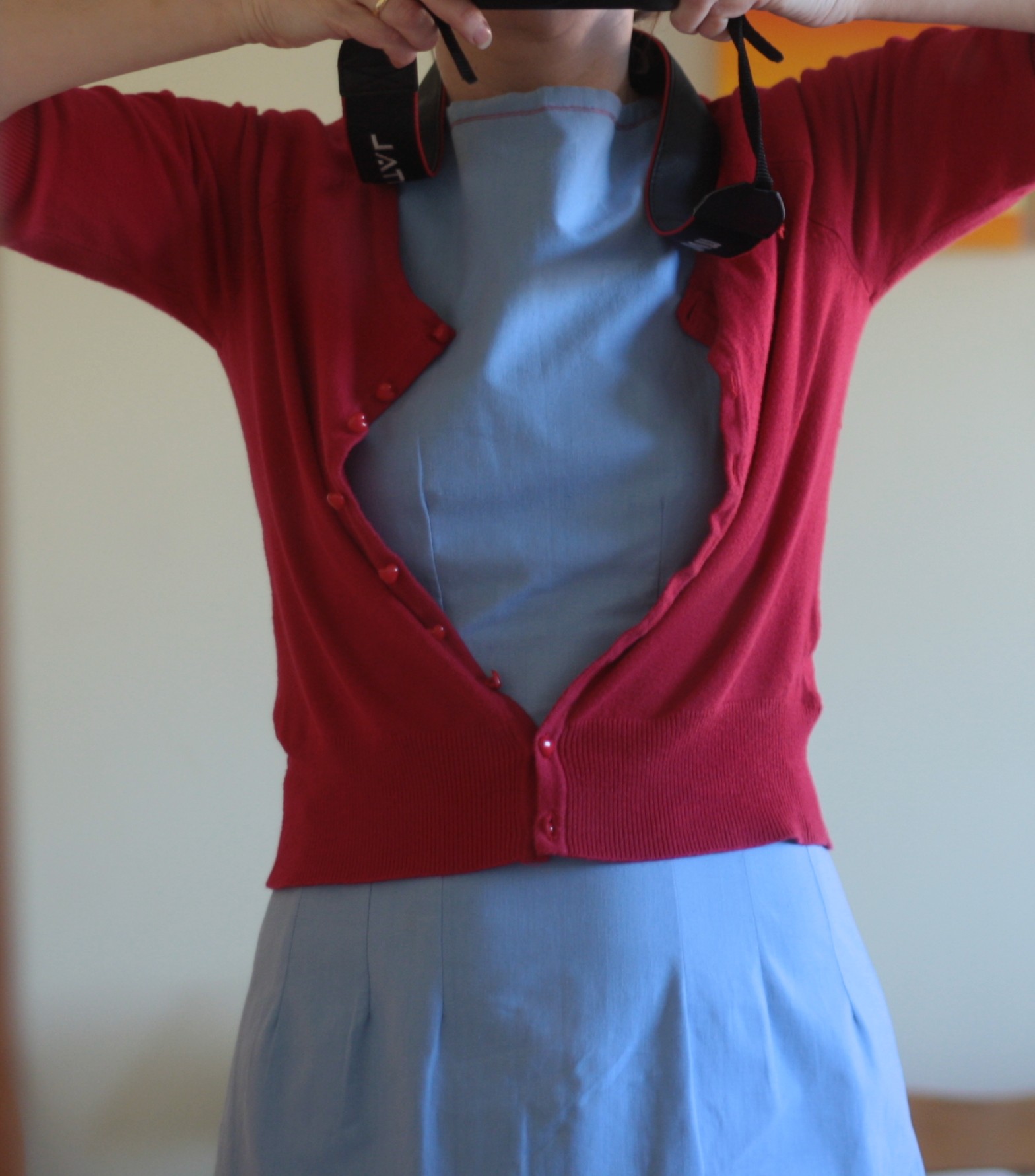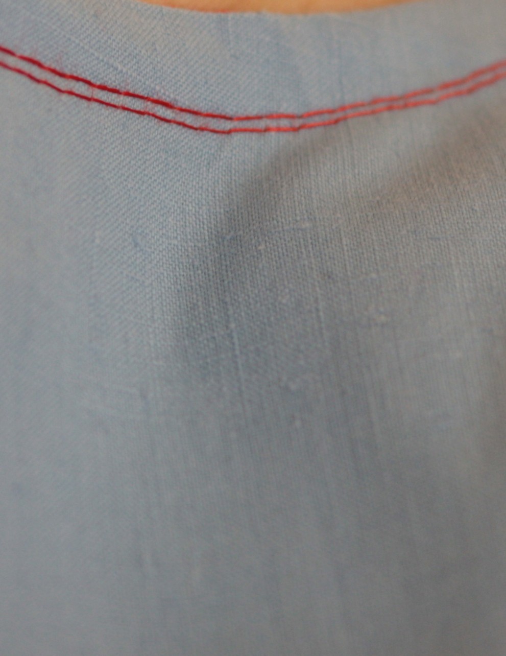 What am I pleased about? I love the red stitching at the neckline which is the result of my one and only dalliance with my twin needle, it even matches very neatly at the shoulder seam.