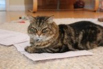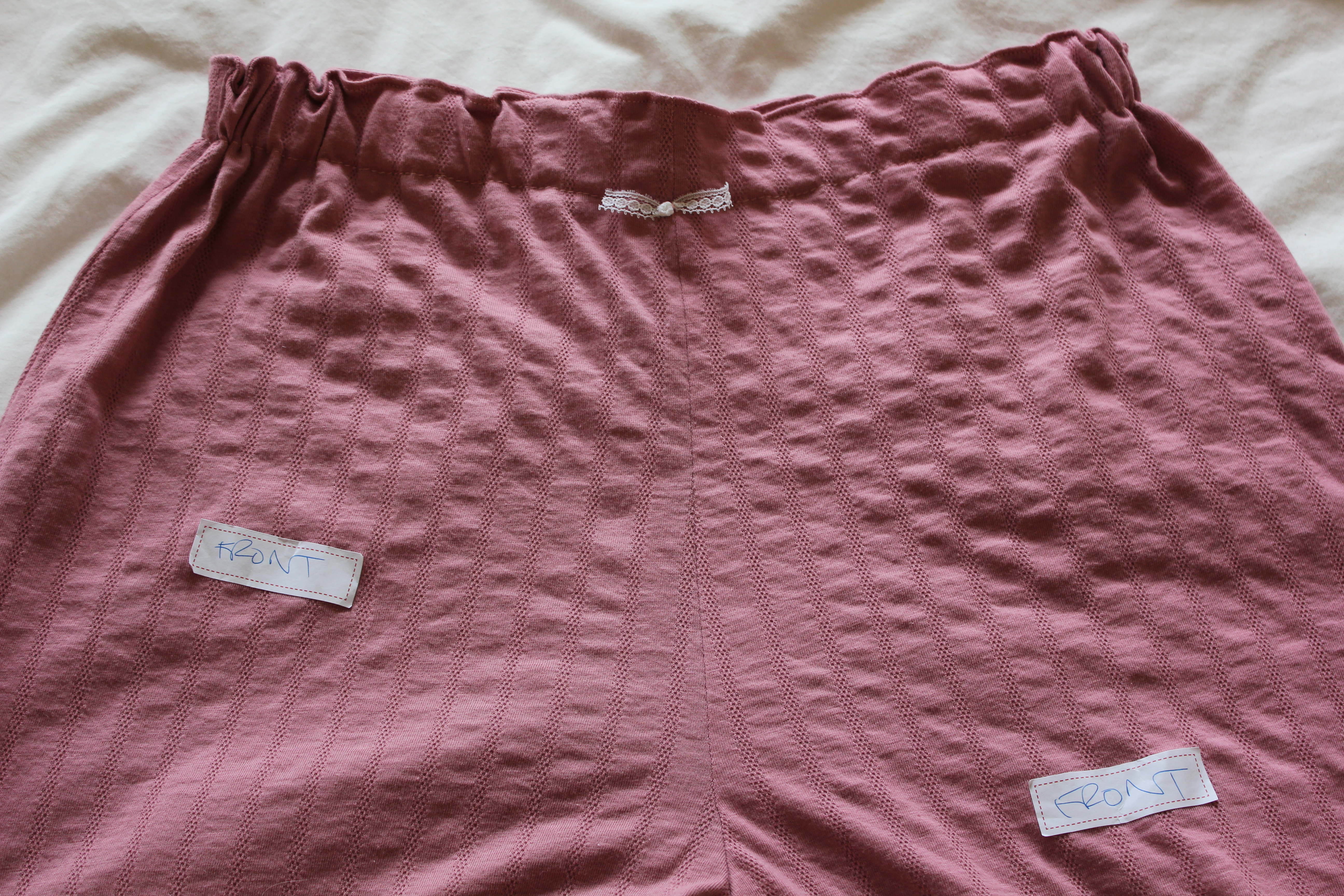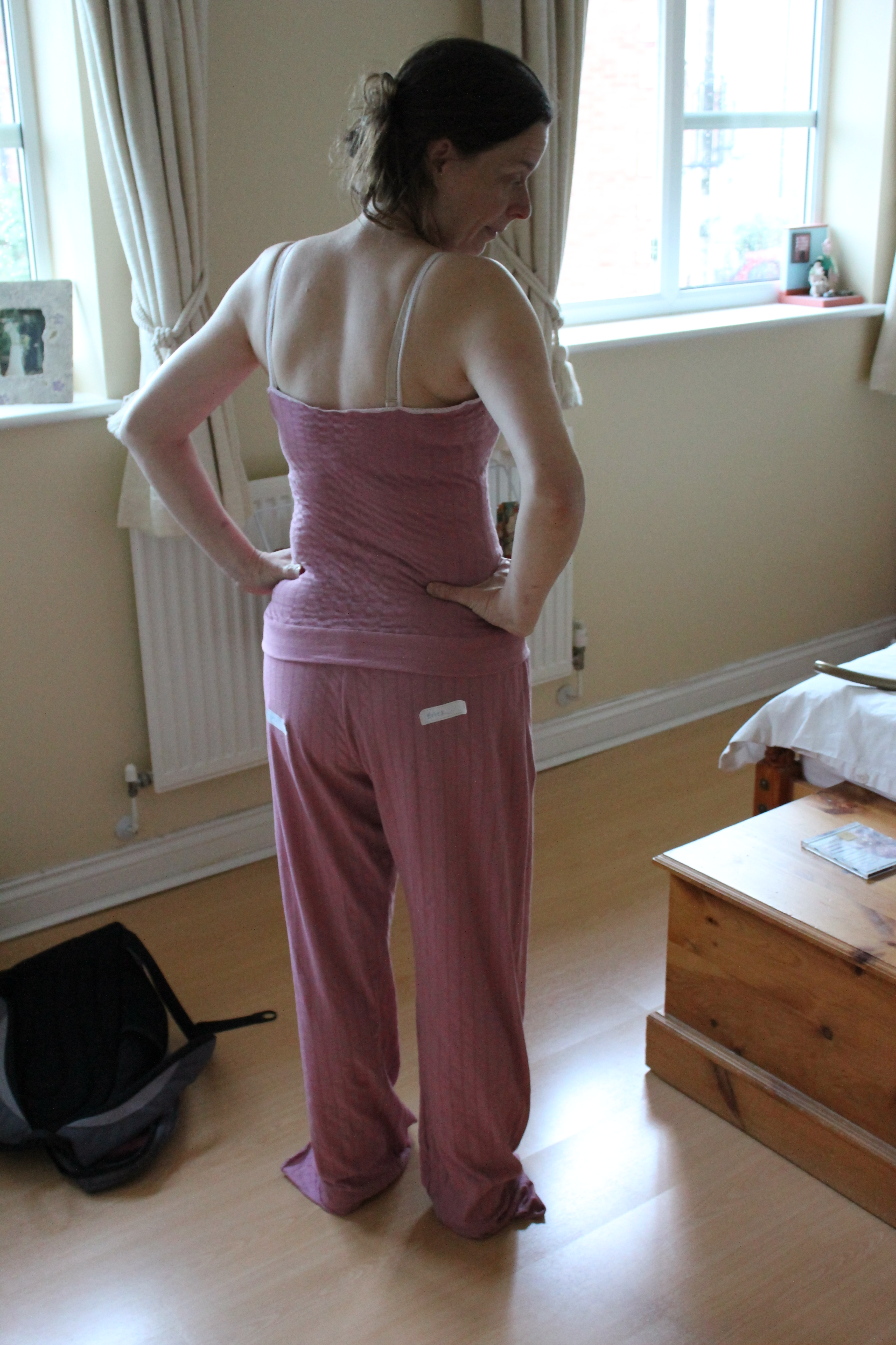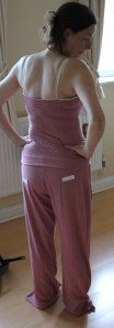 Now, can you tell which one was made using a pattern drafted by someone who knew what they were doing? The ‘trousers’ are my attempt to draft something slim-ish legged, the plan being to be a step nearer to a pair of home-made jeans. I’ve been more than a tad generous with the leg-length there and I can tell you that the combination of long jersey bottoms and laminate flooring is not a good one. I really don’t want another broken toe so I’m going to have to fix those pretty sharpish.