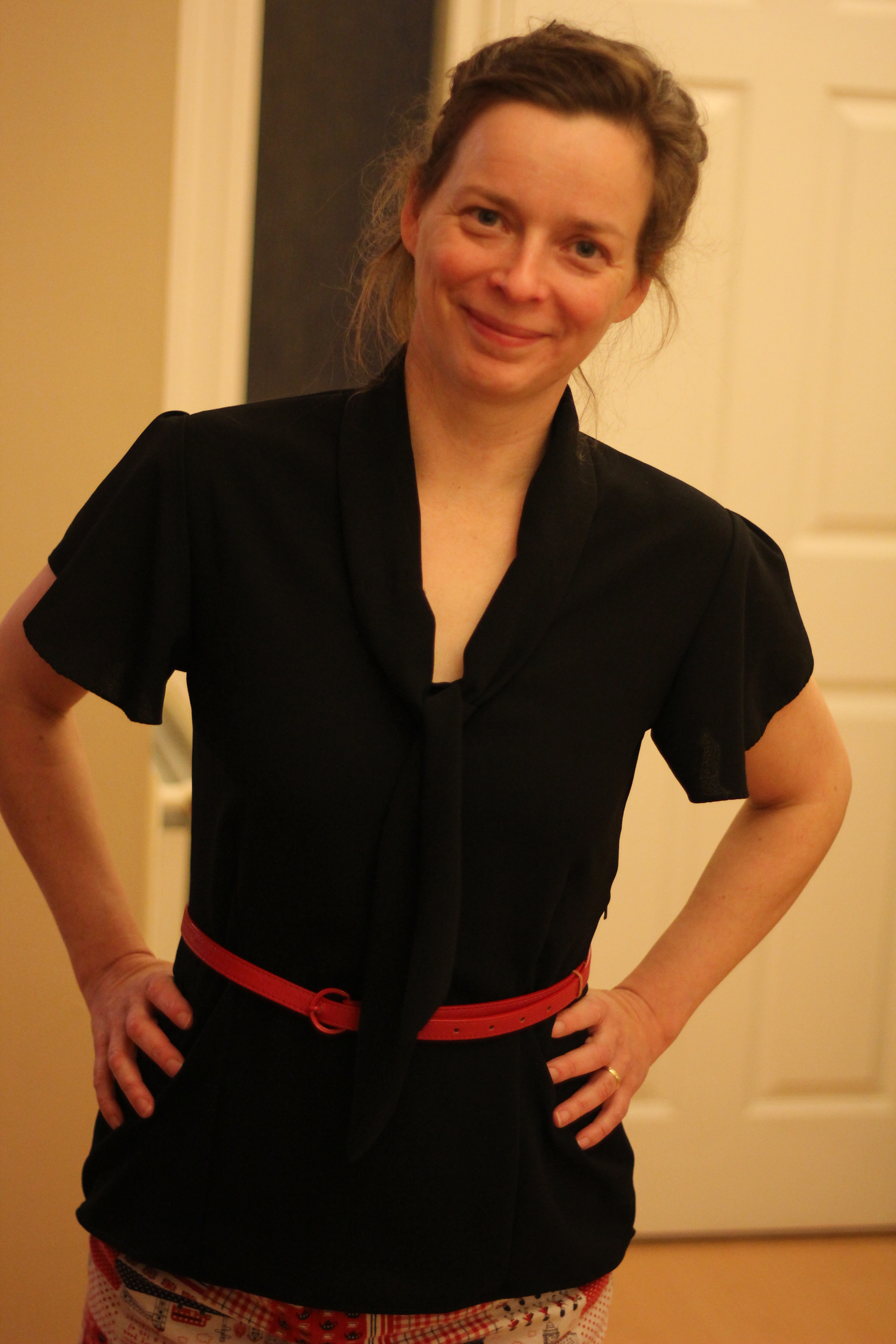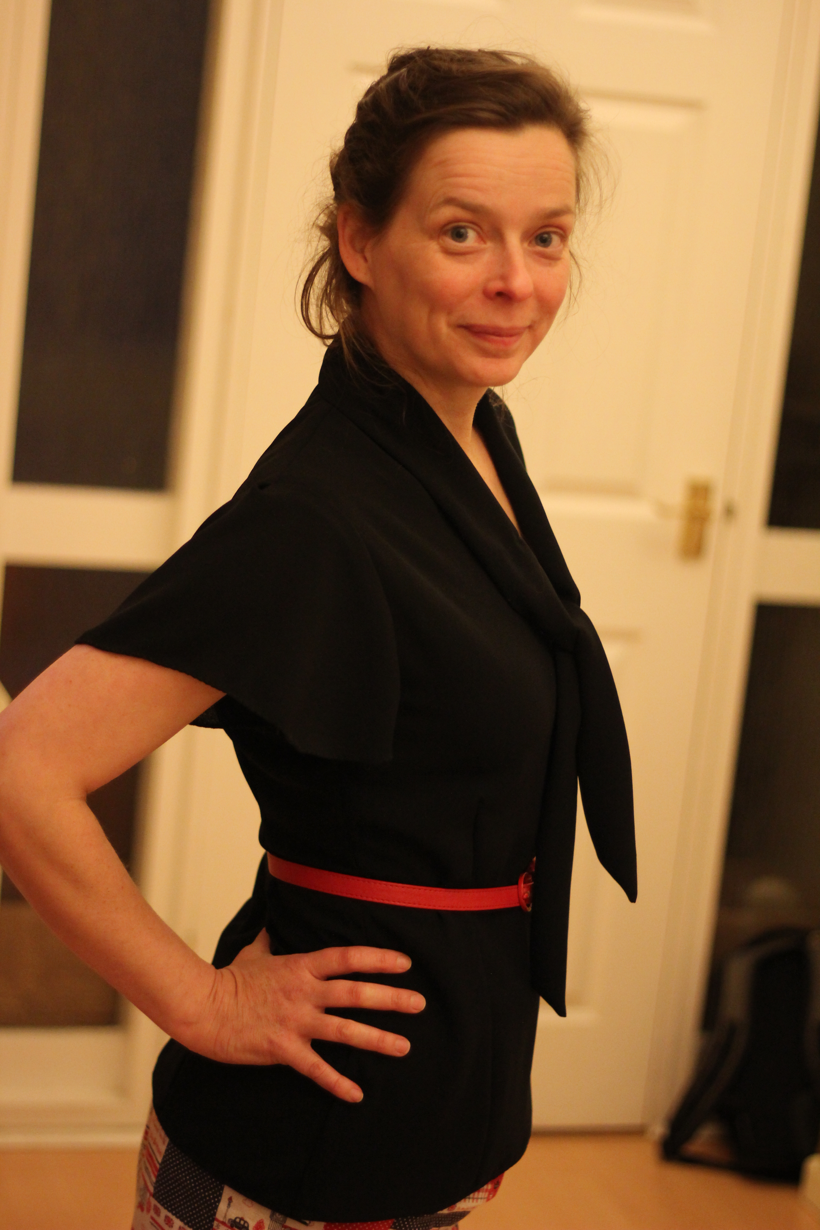 Finally there is Vogue 8380 which did have a special place in my heart being the first make that I managed to trap myself within. Here is where the solitary sewing takes on a new and dangerous dimension. What to do when your dress is half-way off but jammed up onto your left shoulder? Toddle out to your neighbours to request that they cut open your ill-advised button substituted closure? Or struggle with a yoga-like back twist and cut yourself free? I do think that this episode clouded my view of the finished item even when it had a zip. It seems that it was destined to be re-fashioned into.. a tie-fronted top that is imposs. to photograph even for my seasoned and semi-trained other half. Remind you of anyone? Kenny Everett’s Army General? Boy, have I have some shoulders on me. No wonder I got trapped in the original dress.