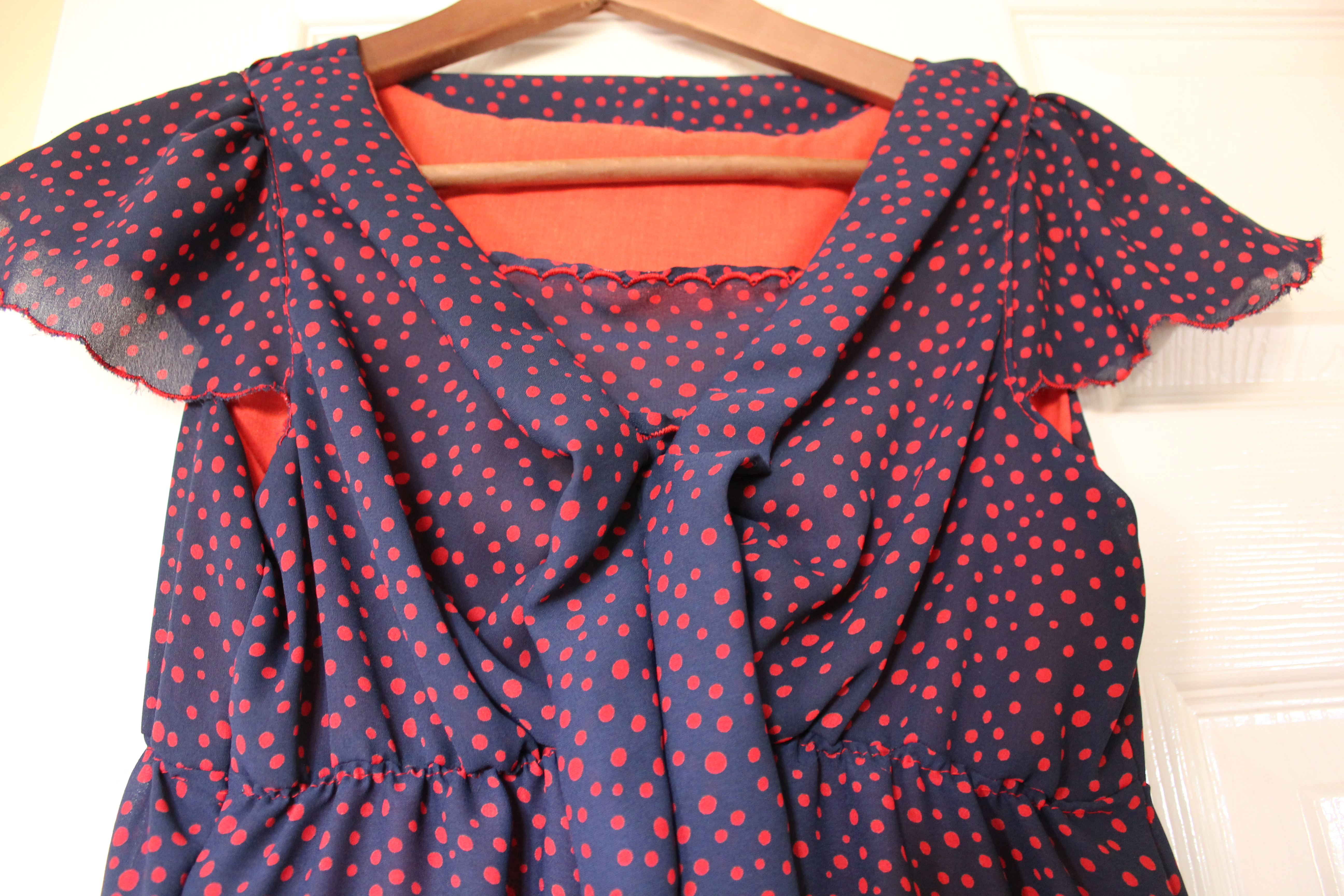 The spots represent my hacked about version of Burda 7605. I lack the skills to go this far off-road. It was too low-cut for an old hag like me so I added a modesty panel, sleeves and a tie neck. I was too lazy to put in a zip so I made it large and threw in some shirring and the pièce de résistance? Choosing scratchy curtain lining fabric for the interior which constantly exfoliates the wearer. Maybe I should patent that idea? Anyways, it is destined to be cropped into a top, or a skirt. Can’t decide.