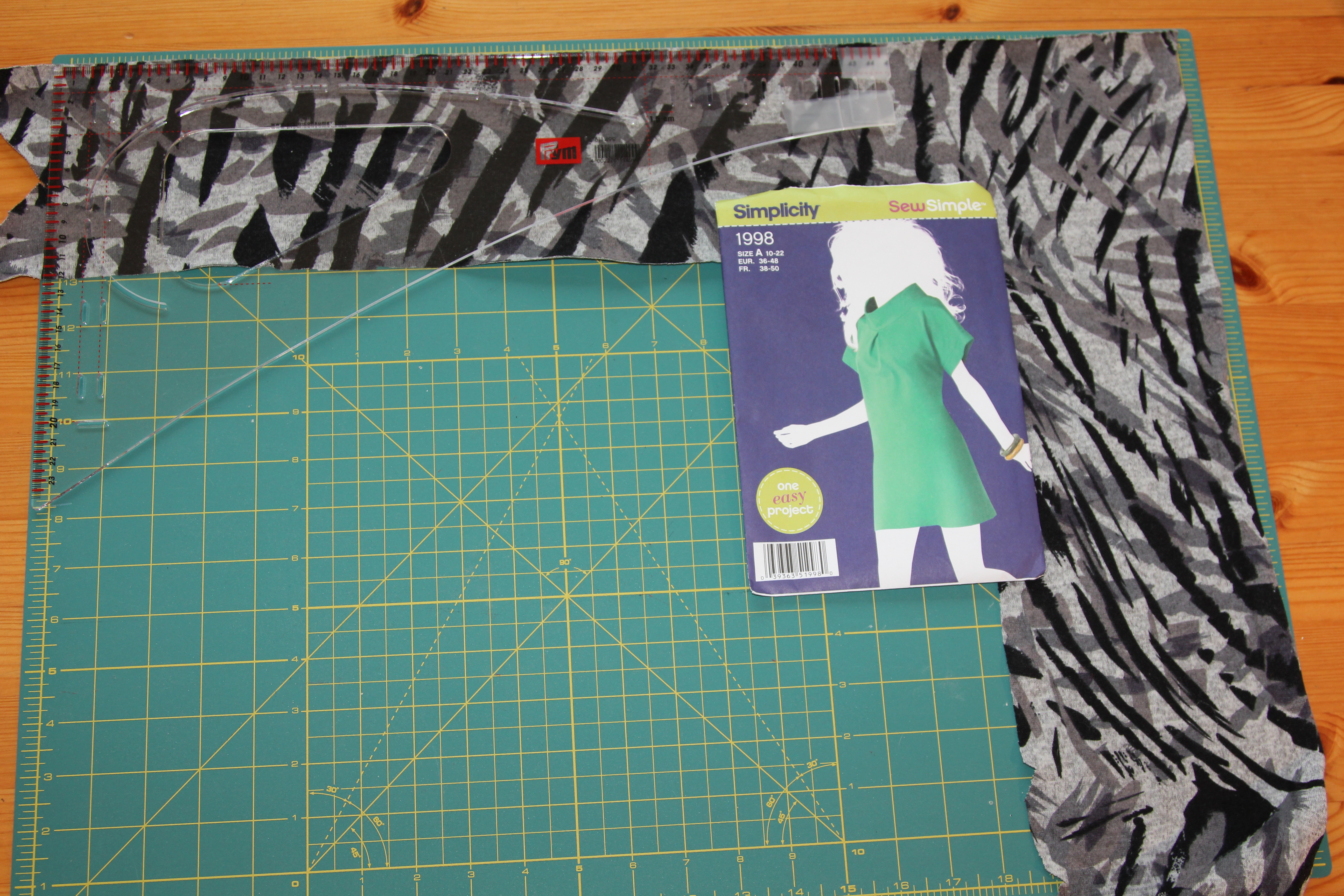 The suggested fabrics for the Simplicity 1998 – Misses’ Pullover Dress are ‘Cottons, Silky types, Lightweight linens’. What I’ve used is a stretchy man-made fibre. The pattern has an unprecedented six and a half inches of ease at the bust. Now, you know my feelings about the ‘sack on the lowliest house-elf’ look. That look would be pretty easy to achieve with this amount of ease. As I was aiming more for action hero than house-elf I have been brutal with the pattern pieces and removed one and a half inches from the neck to the hem of each of the two main pattern pieces, making the completed garment six inches closer to my bust measurement.