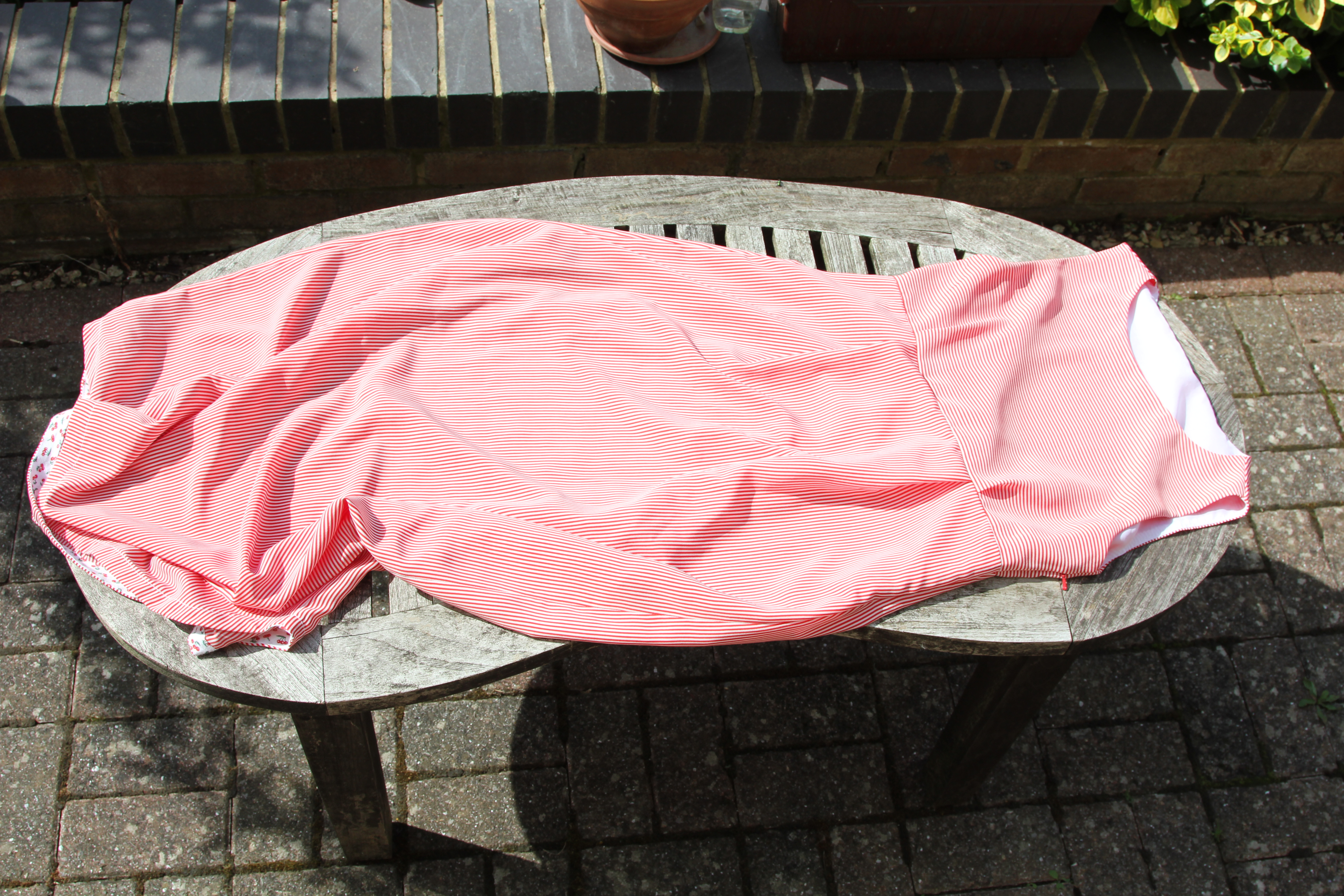It’s a self-drafted, empire-line maxi made from an unidentified charity shop fabric. Probably donated by a Punch and Judy tent maker. Or a barber shop pole painter. Or a strobe-control operative. It’s lined to the knee and has a side zip. I suspect that I will end up reinforcing that waist seam as I’ve had to repair it once already and I’m not sure that I would recommend the bias binding hem finish. A sophisticated rolled hem would look much more slick. Apart from that, she’s great for hiding an unshaven leg or two.