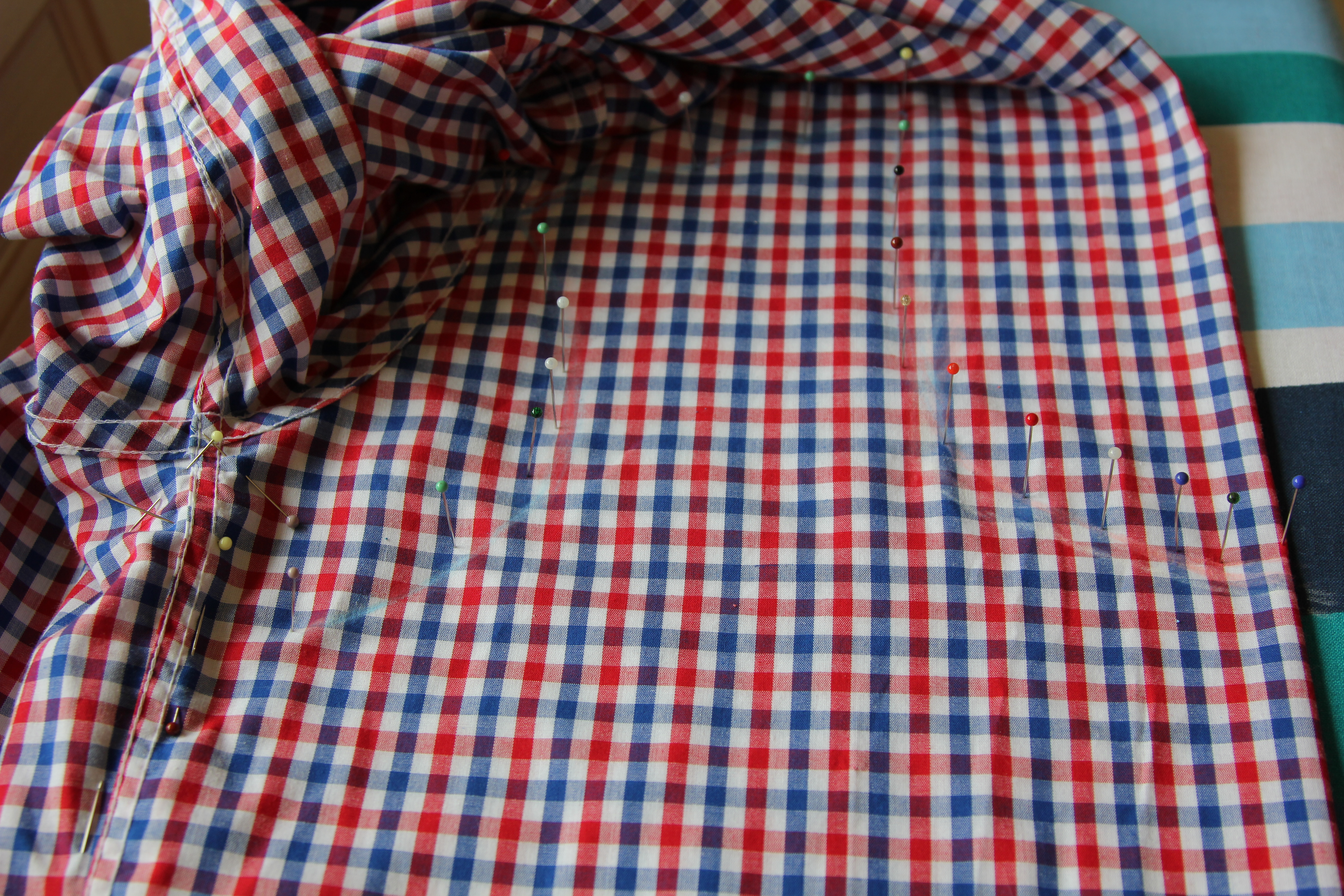 I’ve decided roughly what I’m going to do.  I turn the shirt inside out, pin the side seams of the shirt together and fold the front and the back together at the centre ready for sketching a shape and cutting.  The checks are proving very useful for ensuring my centre front and my centre back folds are spot on.
