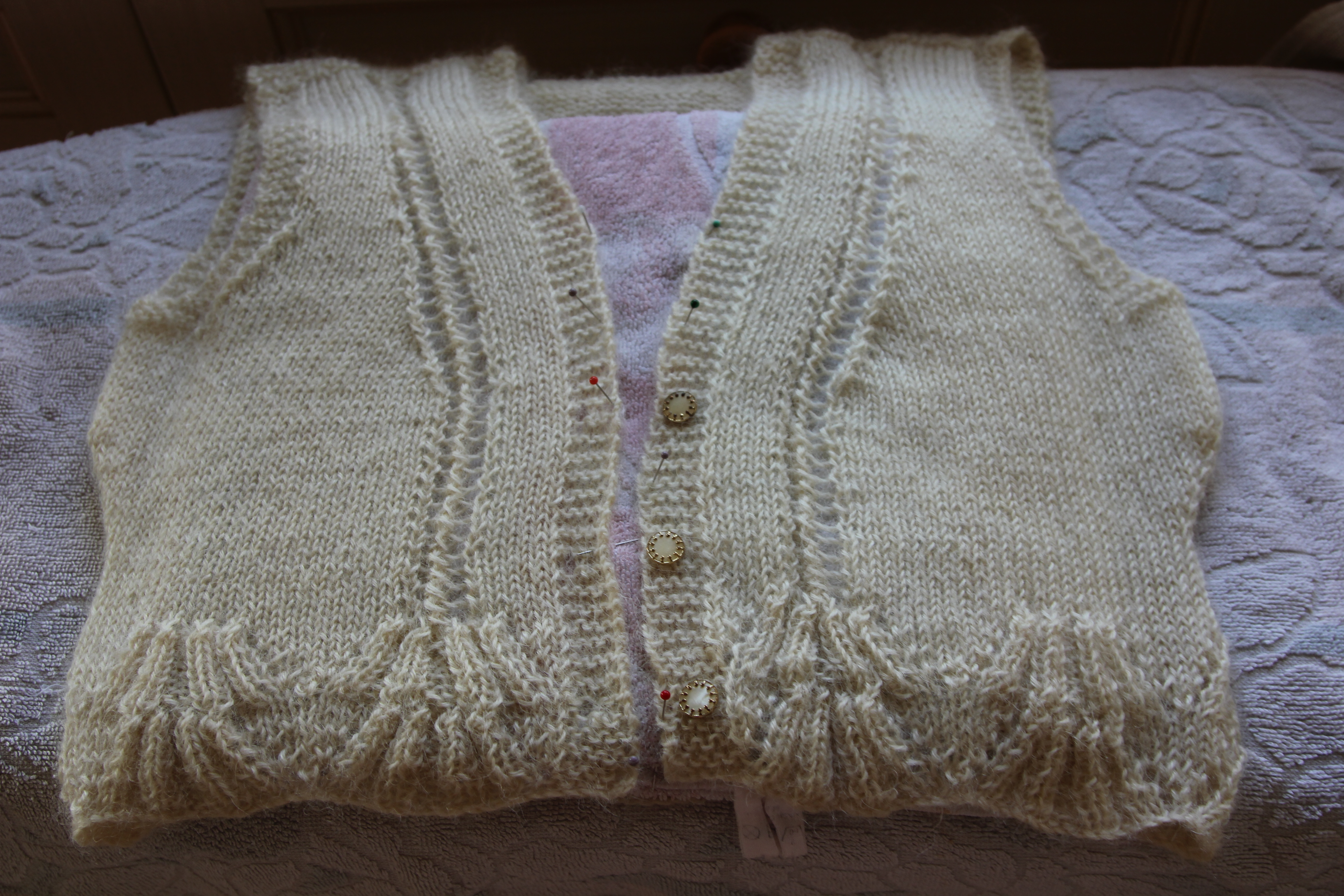How did I find it? Well, the pattern was pretty easy to follow with both written instructions and charts. The waistcoat is knitted from the bottom up in one piece. You make the button holes and the button band as you go and the only seaming needed is the front to the back at the shoulders. There were enough changes of pattern and pace to stop me getting bored and not so much that I got lost and gave up. The giving up is quite likely given how slow I am at knitting, I need to see shape and results pretty quickly.