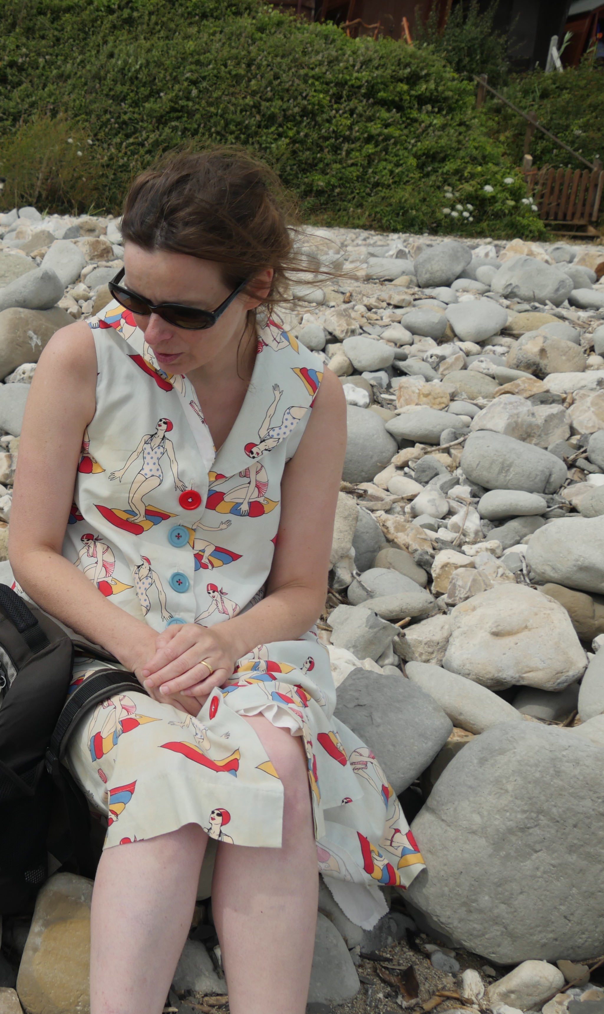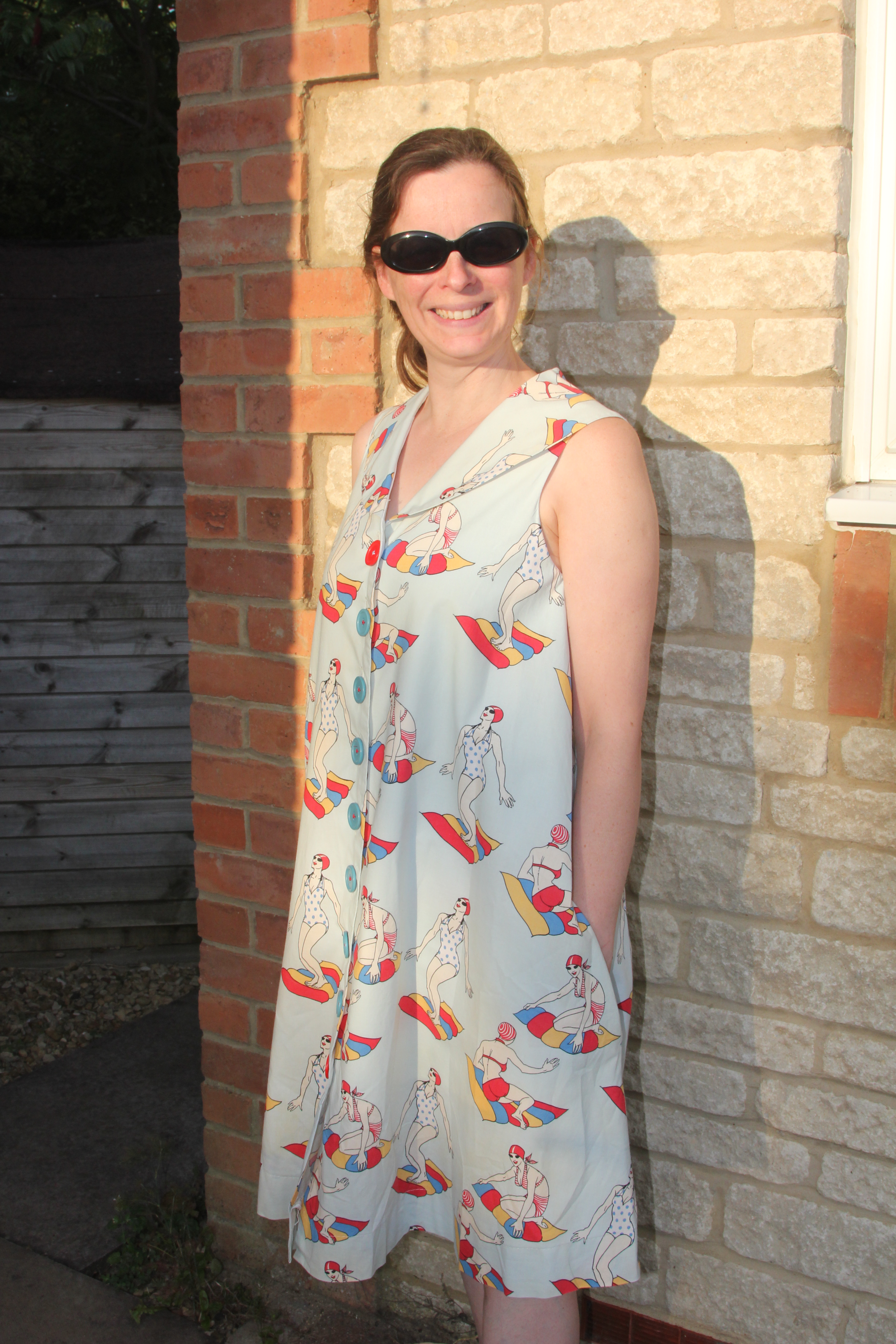 Love the swimmer fabric and that red button topping off the blue ones! And yur sundress looks oh so comfy! Enjoy wearing it!